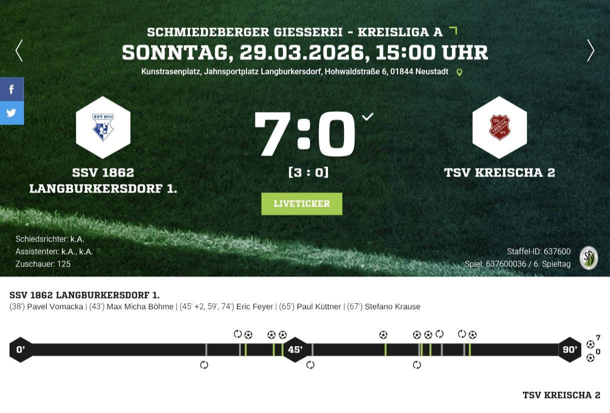 Nun steht zunächst die wohlverdiente Osterpause an, in der wir neue Kraft für den Endspurt tanken können. Unser nächster Auftritt führt uns dann erneut nach Kreischa zum Rückspiel: Anstoß ist am Sonntag, den 12.04.2026, um 12:30 Uhr.