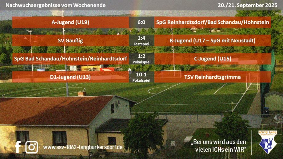 Am Sonntag gab’s zuhause ein deutliches 6:0 gegen die SpG Reinhardtsdorf/Bad Schandau/Hohnstein. Überragend dabei Vincent Rode mit drei Treffern! Außerdem trafen Jaden Gantze, Mikias Gäbel und Louis Rumssauer per Strafstoß. Mit nun 6 Punkten ist das Team punktgleich mit dem Gegner auf Platz 6 der Tabelle. Das nächste Ligaspiel steigt allerdings erst am 25.10. gegen die SpG Wurgwitz/Braunsdorf.