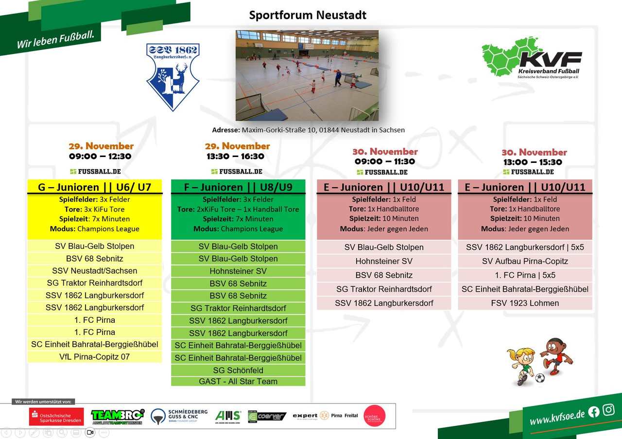 Im Sportforum Neustadt waren über den gesamten Samstag und Sonntag verteilt rund 200 Kinder im Einsatz. Wir haben als SSV 1862 Langburkersdorf erstmals ein offizielles Hallenturnier des Kreisverbands Fußball Sächsische Schweiz-Osterzgebirge (KVFSOE) ausrichten dürfen – und das mit großem Erfolg!