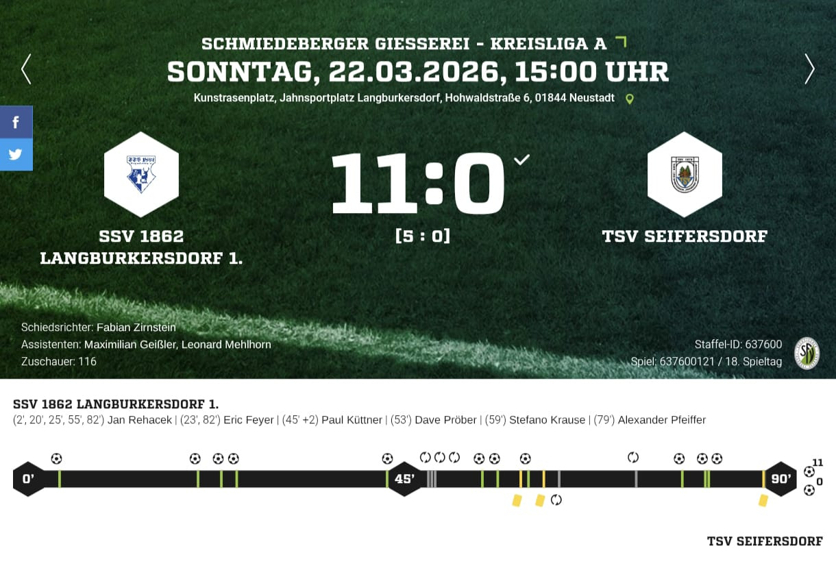 Am Sonntag, den 29.03.2026, steht bereits das nächste Heimspiel an. Dann kommt es zum Nachholspiel gegen die zweite Mannschaft des TSV Kreischa.