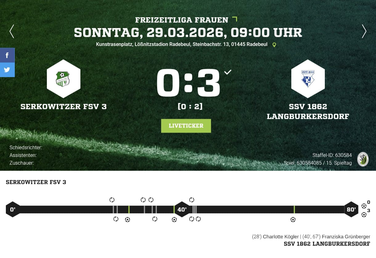 Der SSV Langburkersdorf setzte sich auswärts beim Serkowitzer FSV klar mit 3:0 durch und zeigte dabei über weite Strecken eine dominante Leistung. Bereits der Anstoß um 9 Uhr in Radebeul – und das auch noch aufgrund der Zeitumstellung – sorgte zunächst für einige gähnende Gesichter im Team. Doch das frühe Aufstehen sollte sich lohnen. Von Beginn an übernahmen wir die Kontrolle über das Spiel, ließen Ball und Gegner laufen und erspielten uns zahlreiche Torchancen. Immer wieder gelangen uns schöne Kombinationen und gut herausgespielte Angriffe, die jedoch zunächst nicht belohnt wurden. Trotz der Überlegenheit blieben die Torabschlüsse in der Anfangsphase noch zu uneffektiv.
