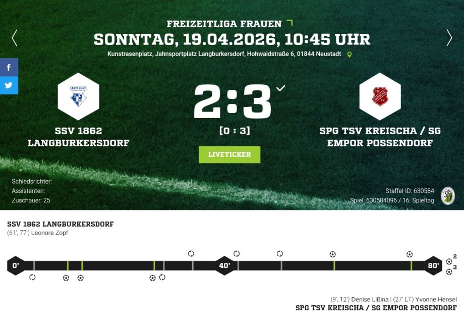 Zur Info: Das Spiel am kommenden Sonntag findet nicht statt und wurde auf den 22.05. 19:00 verlegt. Somit sehen wir uns am 03.05. wieder in Langburkersdorf, wo wir gegen Limbach spielen werden.